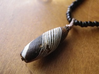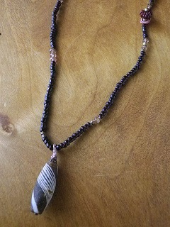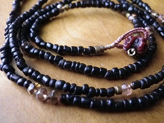 お手持ちのローマングラスのトップをお預かりして制作いたしました。 もともと付いていたシルバーの金具を外し、絹糸でバチカン部分も仕上げています。 留め金は、ワンポイントになるように木の実を使って。 少し明るい色の絹糸を巻きました。 しっとりとしたインドビーズの黒と、天然石の煌めき、 アンティークブラスの落ち着いた光沢が、 トップのローマングラスを引き立て、 シックなロングネックレスに仕上がったと思います。 気に入って頂けたでしょうか? お嬢様と共に、長く楽しんで頂けたらと思っております。 2012.4 金沢にて |