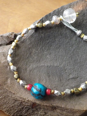 | FBページでご紹介した、チンシルバーとオリッサブラスのブレスレットをご覧になって お気に入りの石で!とオーダーを頂きました。 まず一番最初にお選び頂いたのは、オールド・チベタンターコイズ。 なんともいえない・・・青。 深い艶。 とびっきりの石です。 そして、留め金に古代水晶と、脇に古代瑪瑙。 ターコイズの際には、金赤ホワイトハート。 最後に、糸のお色を選んで頂きました。 丁度良い太さの絹糸に、思う色が無かったので サンプルから選んで頂いた色にあわせ、 絹糸を染めました。 ![]() この色が、全体を明るく仕上げ、とても良かったと思います。 ナイスセレクトでした。 身に付けるほどに、艶の増していくチベタンターコイズ。 輝きをますチンシルバー&オリッサブラス。 アンティークならではの変化を きっと、楽しんで頂けることと思います。 長く長く、お手元に置いて頂ければ嬉しいです。 ありがとうございました。 2012.09 |