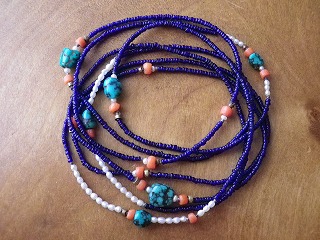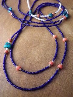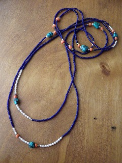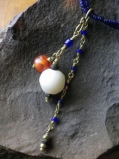 瑠璃色の「い・と」を、とのリクエストで制作いたしました。 ご希望の石など、お話ししながら選んで頂きました。 極小のオールド・インドシードに、希少な小粒のオールド・チベタンターコイズ、 ヴィクトリアンコーラルと、パールをあわせ、 チベタンのテイストを感じるネックレスに仕上げました。 (チベットの女性は、ターコイズに珊瑚、パールをあわせて身に着けています。) インド・オリッサ州に伝わるブラスビーズを、少しスパイスに入れています。 留め金の無いロングネックレスは、自由にお使い頂けます。 2連にしたり、絡めてみたり、ブレスレットにしたり・・・ 楽しんで頂けて、とても嬉しく思います。 ありがとうございます。 ★★★ 追加で、ピアスとペンダントトップを制作させて頂きました。 ピアスは、色艶の良い物を選び、ネックレスとの印象をあわせたデザインにしました。 ペンダントトップは、同じくチベットで大切に使われていたマザーオブパールと 古代カーネリアン、インドのオールド・オリッサブラスを使用しました。 充実した内容のセットになったと思います。 良い仕事をさせて頂きました。 本当に、ありがとうございます。 2012.7 |